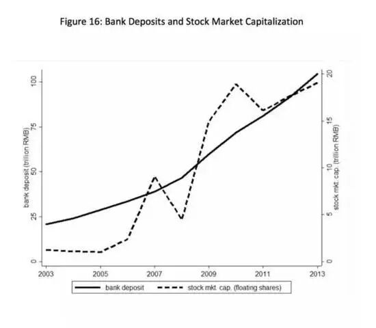 图中虚线给出了中国股市的规模,尽管在此期间快速扩张,然而规模仍然远远小于储蓄的规模。