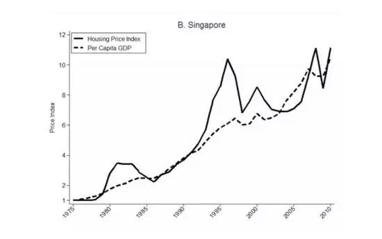 而新加坡房价的上涨与其经济发展水平有很高的同步性,除了两段时间出现了偏离:上世纪八十年代以及亚洲金融危机之前的1995-1997年。在这两段时间之前,新加坡都经历了持续的经济增长,然而当经济下行时,房价水平又回复到了经济增长水平上。