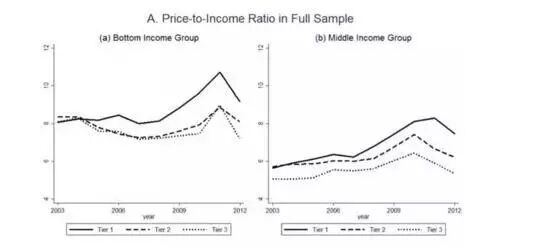 房价收入比是一个非常常用的房价负担的度量。上图给出了2003年至2012年中国的房价收入比的时序图,其中左边为低收入家庭,右边为中等收入家庭。