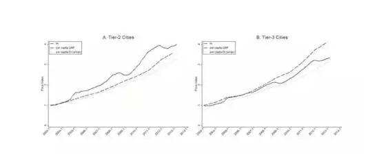 对于二线城市而言,十年期间二线城市的房价平均翻了3.92倍,与此同时房价的波动也比一线城市平缓很多。然而注意到,尽管房价上涨了很多,而人均收入的变化也几乎是同步的。作者认为人均收入的变化代表了家庭对房产需求的变化,而从二线城市的数据中,房价上涨虽然很快,但是似乎与实际需求的背离并不显著。