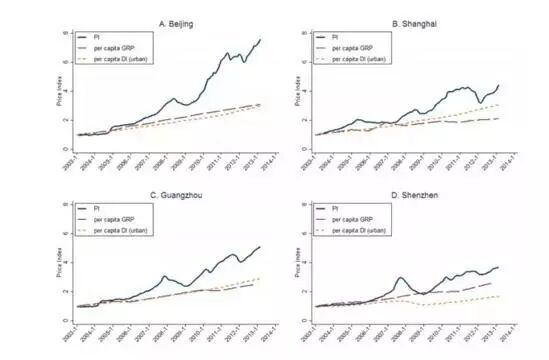 上图是北、上、广、深四座一线城市的房价指数、人均GDP、人均可支配收入。