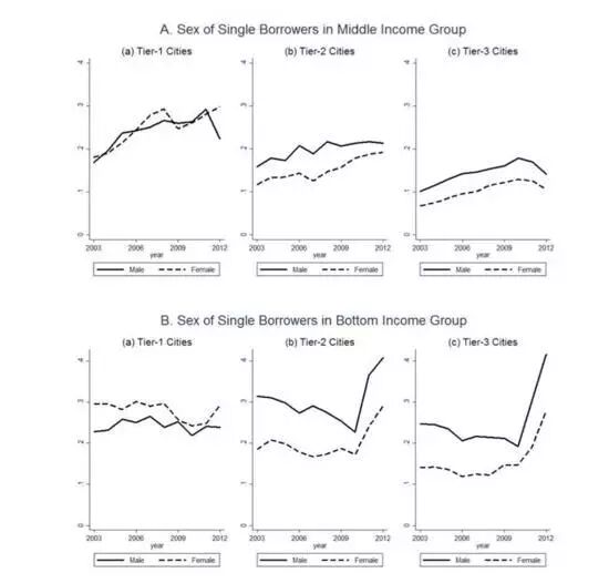 由上图可以看到,在三类城市中,低收入家庭组有大约40%的购房者为单身男女。Wei, Zhang and Liu (2014) 指出,由于性别的不平衡,是否拥有房产是中国男性在婚姻市场上竞争力的重要因素。