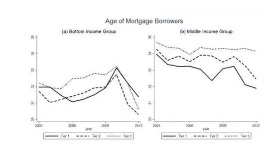 从年龄分布上来看,低收入组似乎比中等收入组更年轻一点,基本上30的头5年是买房的主力军。