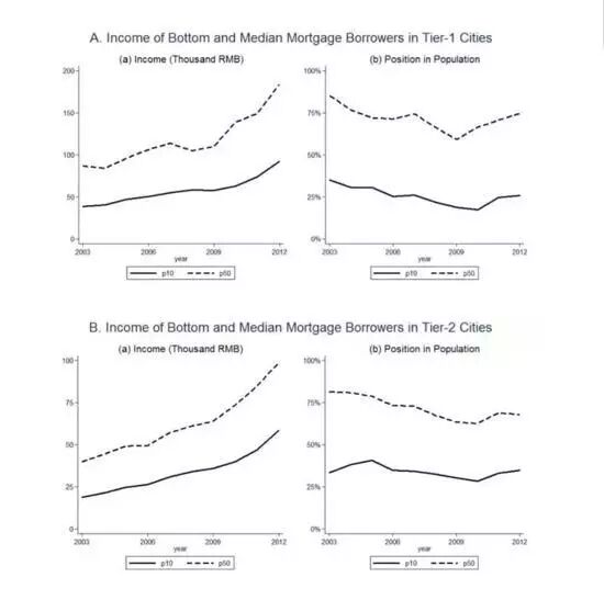 对于每类城市,作者主要集中于两类家庭:所有贷款家庭收入在最低的10%的家庭,称之为低收入家庭(bottom-income borrower group,p10)以及在45%-55%的中等收入家庭(middle-income group,p50)。