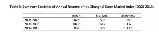 上表总结了上海证券交易所这些年间收益与风险的情况。在这段时间,每年的平均收益大约有7.3%,以及51.5%的波动率(volatility)。如此之高的波动率可能是由于2008年之前的股市泡沫有关,可以看到2009-2013年波动率只有33.9%,当然收益率也只有5.3%。