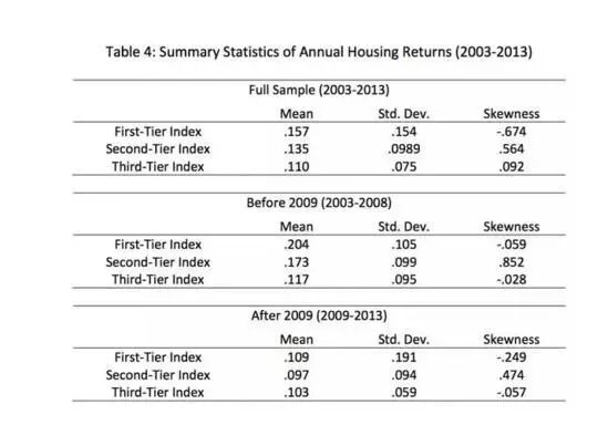 而其中,2009年之前,投资房产的收益率特别高,达到了20.4%,二线城市也有17.3%的年化收益率。而在2009-2013年,平均的收益率也维持在20%左右,相比于股票市场来说,仍然是非常有吸引力的。