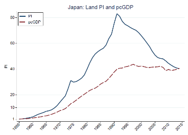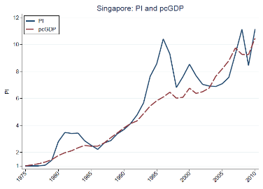 再看一下其他国家的情况,将日本的土地价格和GDP增长连成线(见图4),日本的房屋价格也出现巨幅增长,虽然GDP增长也比较快,但是房价增长得更快,我们在中国也看到了同样的现象。至于新加坡,它有两个阶段的房价增速是低于GDP增速的(见图5),至于这是否是中国的未来,需要你们自己来判断。