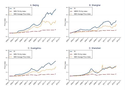 让我们快速浏览一下价格指数,大家都会使用国家统计局的70个大中城市房屋价格指数。根据这个指数我们发现北京的房价指数在十年里从1上升到2,所以北京的房屋价格增值100%,就会引起大家的担忧。同样的事情在上海、广州和深圳都出现了,我不知道这个价格指数怎么构建的,但是这个指数到处都在用,比如华尔街日报、纽约时报,当人们谈论中国房地产市场的时候就会引用这个指数,会说这个月房屋价格涨跌多少等等。