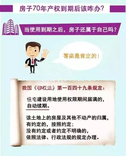 导读 对于大多数人来说,房子这最重要的财产可不容一点马虎!70年后,我们的房子还属于我们吗?到期后,我们又该做点啥?我们为您梳理。 土地使用权和房屋所有权有啥区别? 土地使用权是国家向组织、机构及个人出让的土地使用权利,根据《中华人民共和国宪法》,土地的所有权归国家和集体所有。土地使用权在出让时根据开发类型分为不同的使用年限,民用住宅用地权属年限最高为70年,工业用建筑用地和综合类用地最高为50年,商用建筑用地最高为40年。 房屋所有权属于个人产权,是私有财产权的一种,是得到《中华人民共和国宪法》保护的。根据《中华人民共和国物权法》(自2007年10月1日起施行)第六十四条,私人对其合法的收入、房屋、生活用品、生产工具、原材料等不动产和动产享有所有权。其年限是永久的。 土地使用权和房屋所有权的区别在于:房屋所有权(即房产权)是永久的,没有期限限制,只要房产没有完全毁损灭失就能一直享有,“房产证里是没有期限登记栏的”;土地使用权是有期限的。国家通过土地有期出让方式,授予用地人40年、50年、70年不等的使用权。 也就是说,房子的所有权是永久的,只要房子不塌,这房子就一直是产权人的。但我们是社会主义国家,土地是国家的。根据项目的立项不同,租用国家土地的周期也不同,住宅70年,工业/科教文卫体/综合类50年,商业/旅游/娱乐40年。 土地使用年限到期怎么办? 1、延长土地使用权期限。可以由房屋业主联名提出,补交土地出让金,这个价格应该低于同类的土地出让金的价格,类似于成本价和市场价的差额。 2、根据规划需要,国家收回土地和地上建筑物的,对业主进行相应补偿,用类似拆迁安置的办法解决。 通过调查了解,第一种方法得到大家的普遍认可,也有一部分人认为房子根本就住不到70年就会拆迁。 不管是40年、50年还是70年,都有到期的时候,土地使用年限到期后,只要房子还能住,就都得续签土地。这就是关键了,怎么续签?续签金额怎么计算?根据国家现行的相关规定,土地到期后按照当时的楼面毛地指导价格,依一定比例缴费。 房屋70年产权,意味着什么? 70年房屋产权怎么算? 未来,70年土地使用权到期后,我们该怎么办?