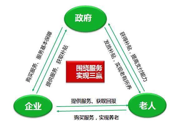 首先,对政府来说,实现所有老人老有所养目标,尤其是对中低收入者,政府可以通过购买企业服务或补贴老年人,相当于短时间内整合社会资源为政府所用,从而实现90%服务工程。