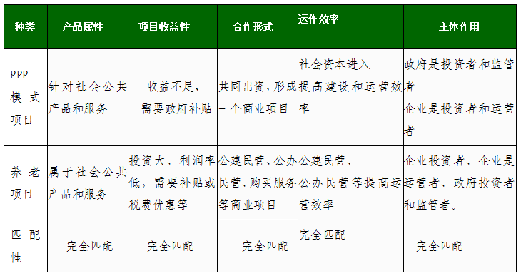 首先项目性质是由政府投资并提供的社会公共产品和服务;二是项目本身的收益不足以弥补建设和运营成本;三是可通过政府与社会投资者以某种形式共同出资(政府提供前补贴,即政府提供一次性建设补贴;政府提供后补贴,即项目建成后政府给的运营补偿),使其变成一个商业运作的项目;四是可以通过社会投资和运营,提高项目的建设和运营效率;五是政府即是投资主体,又是监管主体,社会投资者即是投资和建设主体,又是运营主体。对于PPP模式的五个特征与养老行业特征进行对比,不难发现二者几乎存在100%的匹配性,详见表2-1。
