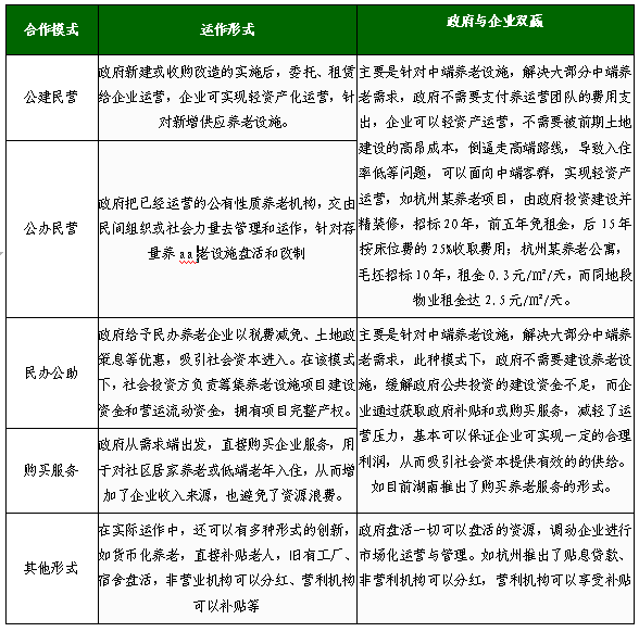 基于一般PPP模式与养老行业的嫁接,笔者在研究中总结养老行业的PPP模式可以是多种表现形式,如提供土地、解决用地难,实行委托经营、使企业可以实现轻资产运营等等,详见下表2-2所示。