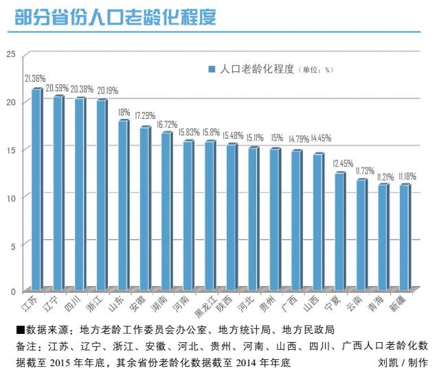 从各省(自治区)老龄化程度排名看,江苏、辽宁、四川、浙江、山东排在前5名,2015年底人口老龄化比率分别为21.36%、20.59%、20.38%、20.19%、18%。