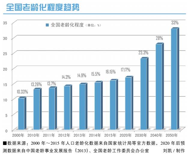 人口老龄化,是指60岁以上老年人口或65岁以上老年人口在总人口中的比例超过10%或7%。按照这个标准,中国早已进入老龄化阶段。2015年年底,中国老龄人口比16.15%,较2014年上升近0.65个百分点。从2016年到2025年,中国社会将经历一个“超速老化”的阶段。2020年之后,中国将迎来“人类历史上人口老龄化最大的浪潮”。
