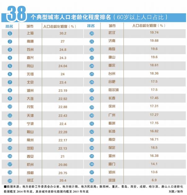 一线城市也面临这样的境况。在北上广三个特大型城市中,上海“老”得遥遥领先。上海市民政局、市老龄办、市统计局联合发布数据显示,截至去年12月31日,上海全市户籍人口为1442.97万,其中60岁及以上老年人口435.95万,占总人口的30.2%,比重较2014年增加了1.4个百分点。这意味着,上海成为中国第一个进入老龄化“30时代”的城市,老年人比例接近全国数据的2倍。上海市政协主席吴志明表示,预计到2020年,上海市户籍人口老龄化程度将达到36%,常住人口老龄化程度也将超过21%。