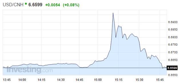 30日,离岸人民币兑美元盘中跳水,从6.6600元水平附近跌至6.7021元,10多分钟内下跌逾400点。目前离岸人民币跌幅收复大部分失地,报6.6599元。