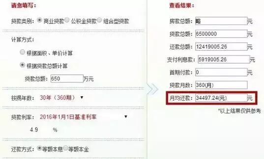 B先生是企业高管,假设他购买的是1300万元的住宅,通过商业贷款按揭五成供30年,同样是等额本息的还款方法,月均还款额约34497元,其中约16442元是利息支出。