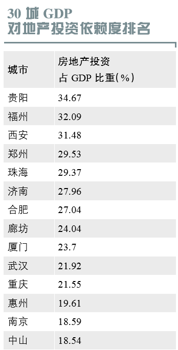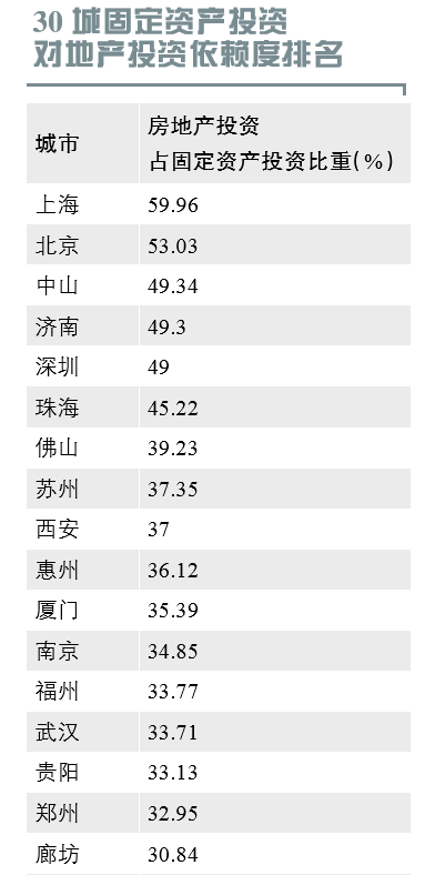 而中国房地产报记者通过统计全国30个主要城市房地产投资依赖度发现,固定资产投资对地产投资依赖最严重的前十名城市分别是:上海、北京、中山、济南、深圳、珠海、佛山、苏州、西安、惠州;而GDP对地产投资最为依赖的前十大城市分别是:贵阳、福州、西安、郑州、珠海、济南、合肥、廊坊(24.04%)、厦门、武汉。对房地产投资依赖症最严重“两榜题名”的城市分别是:西安、珠海、济南。