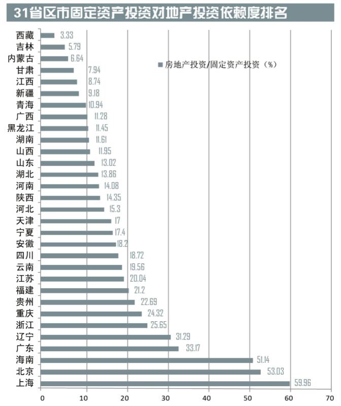 虽然北京、上海、深圳房地产投资占固定资产投资的比重分别高达59.96%、53.03%、49%,但这三个城市房地产投资占GDP投资的比重却不高,分别为13%、14.08%、7.16%。“地产投资占固定资产投资比重,并不能完全说明一个省份对房地产的依赖度,因为像上海和北京这样的中心城市,基建和工业投资的空间已经不大,地产投资在固定资产投资中占比高,但占GDP比重相对有限。”有专家指出。