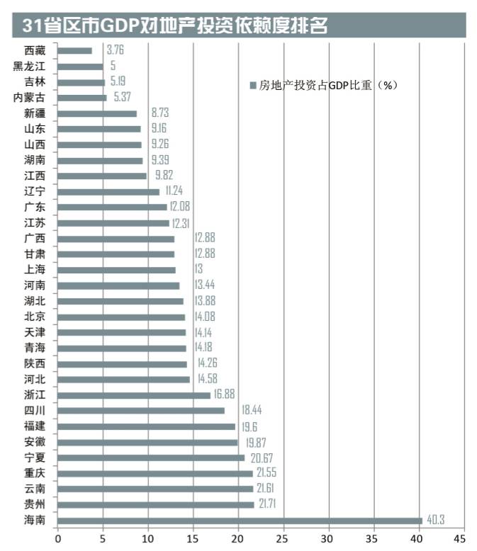 值得注意的是,这两项指标均超过合理值的省份分别是海南、浙江,而这两个省份多年来一直都是严重依赖房地产投资的地区。同样严重依赖房地产投资的还有贵州,GDP对房地产投资依赖度达到21.71%。