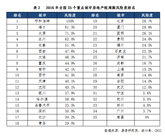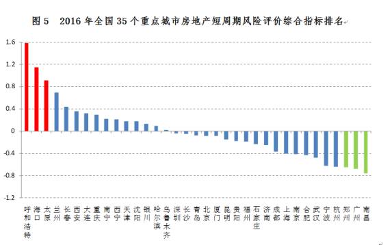 近日,上海易居房地产研究院发布的《2016年中国35城房地产短周期风险识别系统》报告显示,根据预测,未来一年(2016年下半年~2017年上半年)内呼和浩特、海口、太原、兰州、长春楼市风险最大;南昌、广州、郑州、杭州、宁波的风险最小。