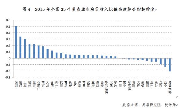(注:依据全国35城2015年的房价收入比偏离度,和近两年这些地区房价收入比偏离度的变化水平,分别按照一定权重进行量化处理,报告得出2015年全国35城房价收入比偏离度综合排行榜。得分越高,房价偏离越大,市场风险越大。反之,则风险越小。)