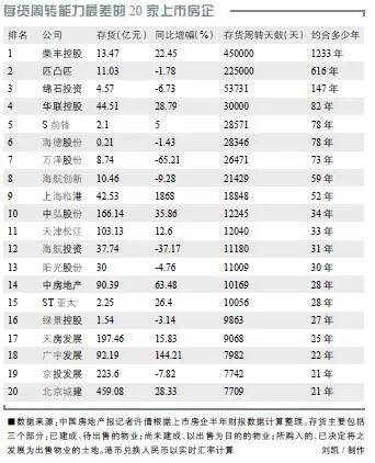 根据中国房地产报记者统计的上半年存货周转能力最差的20家上市房企,其存货周转期均在20 年以上,且其中11 家存货量仍在攀升。