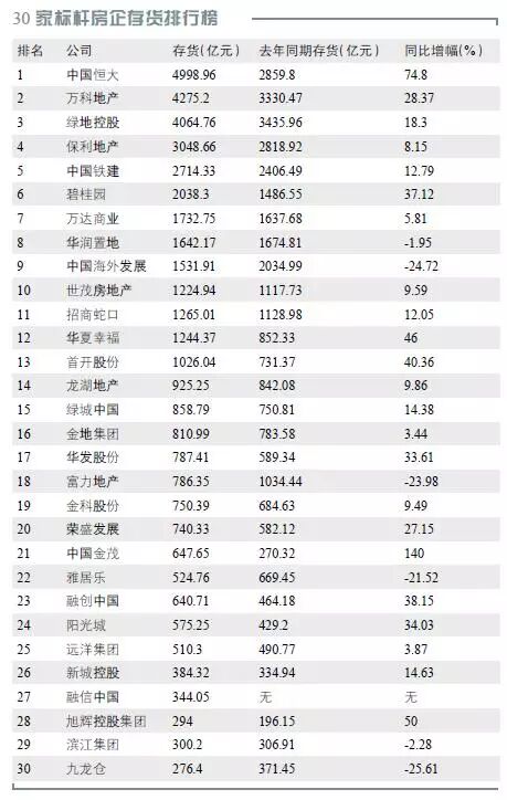土地储备的大幅增长,使得存货资源越来越集中于标杆房企。根据中国房地产报统计的30家标杆房企存货排行榜,排在前3名的是中国恒大、万科地产、绿地控股,其中,中国恒大以4998.96亿元存货居榜首。存货值同比上涨了74.8%。