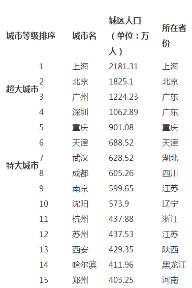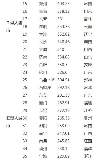 表1:中国城区人口规模前35强城市