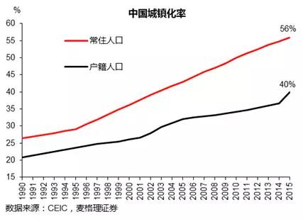 如上图,2015年我国常住人口城镇化率56.1%,户籍人口城镇化率37.5%,其中2.6亿被统计为非户籍城镇常住人口的农民工及其家属。