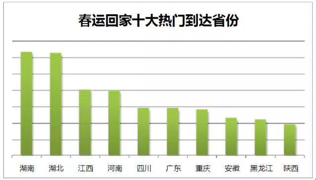数据显示,2017年春运期间我国前十大热门到达省份分别为:湖南、湖北、江西、河南、四川、广东、重庆、安徽、黑龙江、陕西。