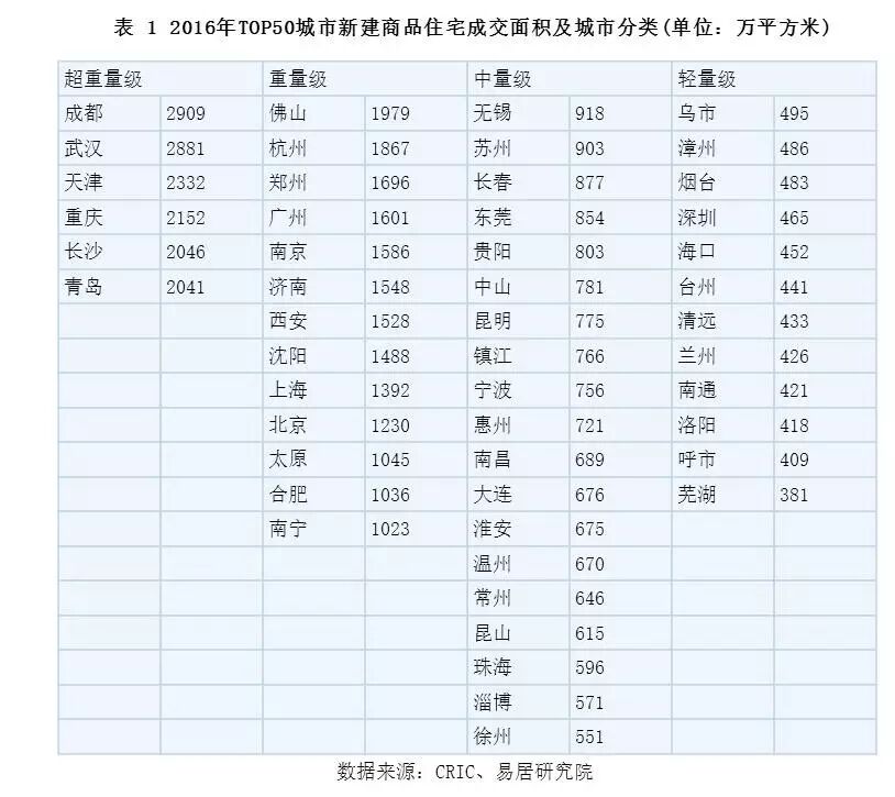 基于不同的成交面积,以及考虑到2016年房地产市场较为火热的因素,我们对TOP50城市进行了分类,如下表。分类标准为:1、超重量级城市:成交面积超过2000万平方米。2、重量级城市:成交面积介于1000-2000万平方米之间。3、中量级城市:成交面积介于500-1000万平方米之间。4、轻量级城市:成交面积低于500万平方米。