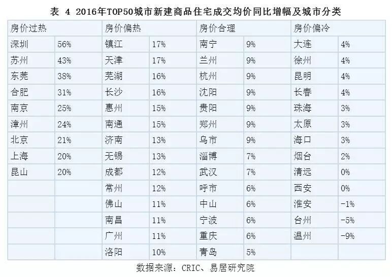 基于不同的成交均价同比增幅,我们对TOP50城市进行了分类,如下表。分类标准为: 1、房价过热:同比增幅超过20%。2、房价偏热:同比增幅介于10%-20%的区间(2016年全国商品住宅成交均价同比增幅为11.3%).3、房价合理:同比增幅介于5%-10%的区间(其中2016年GDP的同比增速为6.7%).4、房价偏冷:同比增幅低于5%。