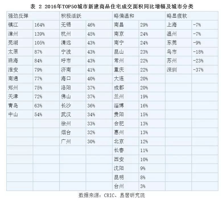 基于不同的成交面积同比增幅,我们对TOP50城市进行了分类,如下表。分类标准为:1、强劲反弹:同比增幅超过50%。2、积极活跃:同比增幅超过全国平均水平(2016年全国商品住宅成交面积同比增幅为22.4%),我们将其定义为30%-50%的区间。3、略偏温和:同比增幅介于0%-30%的区间。4、略显疲软:同比增幅低于0%。