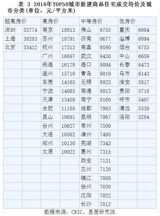 三、 2016年TOP50城市的成交均价排行