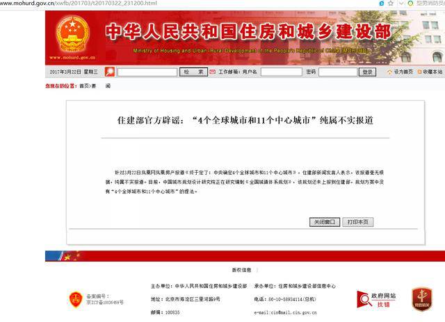 中房报记者 陈青蓝 北京报道 住建部网站于3月22日发表了一篇声明,针对3月22日凤凰网凤凰房产报道《终于定了:中央确定4个全球城市和11个中心城市》,住建部新闻发言人表示,该报道毫无根据,纯属不实报道。目前,中国城市规划设计研究院正在研究编制《全国城镇体系规划》,该规划还未上报到住建部,规划方案中没有“4个全球城市和11个中心城市”的提法。 中国房地产报记者打开凤凰房产网页,发现该篇报道已被删除。 国家中心城市,是住房和城乡建设部编制的《全国城镇体系规划》中提出的处于城镇体系最高位置的城镇层级。国家中心城市在全国具备引领、辐射、集散功能的城市,这种功能表现在政治、经济、文化、对外交流等多方面。 截至目前,中央以文件形式正式公布的按照国家中心城市规划、定位或者以建设国家中心城市为目标的城市有北京、天津、上海、广州、重庆、成都、武汉、郑州。其中,2010年2月,住房和城乡建设部发布的《全国城镇体系规划纲要(2010-2020年)》提出建设五大(北京、天津、上海、广州、重庆)国家中心城市的规划和定位。2016年5月,经国务院同意,发改委和住建部联合印发《成渝城市群发展规划》,首次明确提出成都要以建设国家中心城市为目标,增强成都西部地区重要的经济中心、科技中心、文创中心、对外交往中心和综合交通枢纽功能。2016年12月,国家发改委印发《促进中部地区崛起“十三五”规划》中明确提出,支持武汉、郑州建设国家中心城市。 而去年有媒体报道称,住建部正在编制《全国城镇体系规划(2016-2030)》,涉及确定多个“国家中心城市”。消息一出,很多城市都表示要争取进入国家中心城市之列,其中包括沈阳、南京、武汉、长沙、成都、郑州、杭州、西安、青岛、宁波、厦门等众多城市。 今年两会期间,住建部部长陈政高表示,国家已陆续定位了多个国家中心城市,下一步还将继续推进,还会产生新的国家中心城市,但具体数量目前还没有确定。